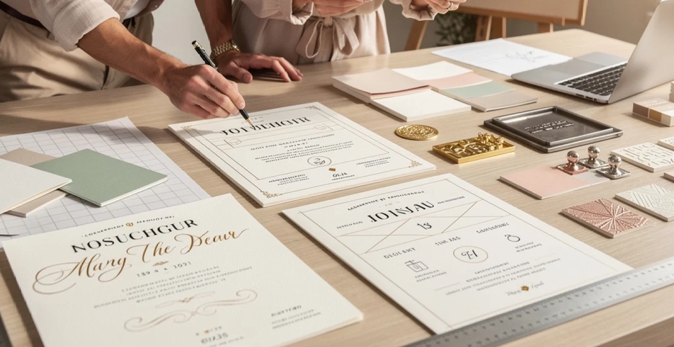 When planning foil applications, consider both design restraint and paper compatibility. Excessive foil coverage can overwhelm the layout and may increase production costs, so prioritise high-impact elements like the couples’ names or a minimalist border. Heavier, smoother papers generally yield the cleanest foil impressions, while textured stocks can produce slightly irregular reflections that some couples find charming and artisanal. Always request a production proof if possible, particularly when combining foil stamping with letterpress or digital printing on the same piece.