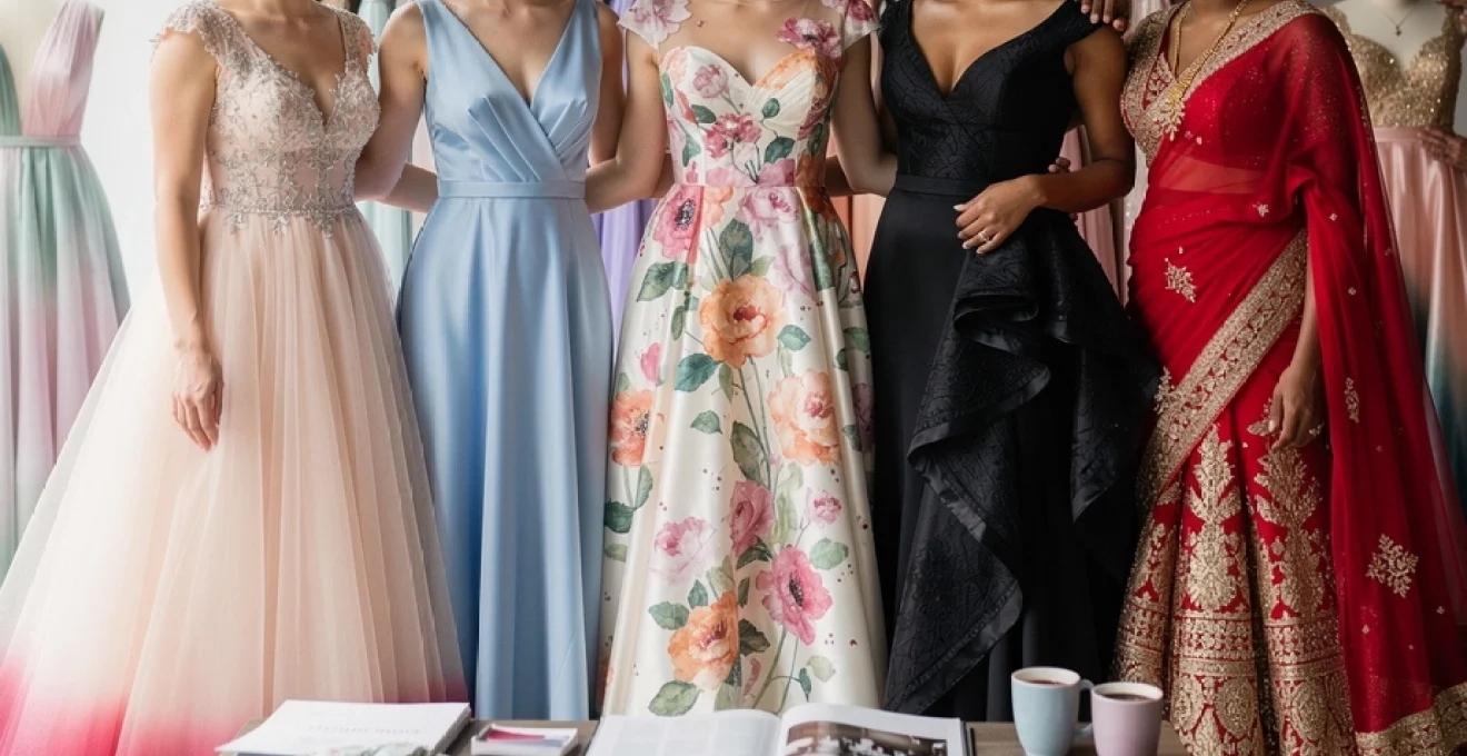 Styling also plays a key role in showcasing a coloured wedding dress. Neutral or complementary florals—such as white and greenery with a red gown, or soft pinks with a blue dress—ensure your bouquet does not compete with the main garment. Similarly, selecting bridesmaids’ dresses in harmonising colours, rather than identical shades, creates depth in group photos while keeping you as the focal point. Think of your wedding party and décor as the supporting cast that frames your chromatic bridal look.